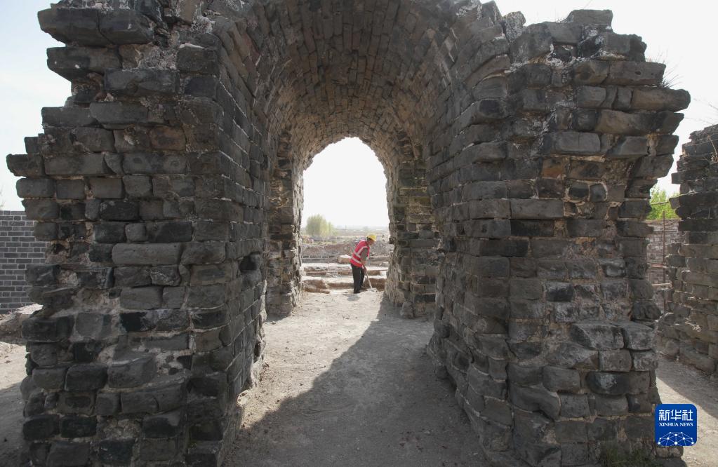 4月19日,工人在山海關(guān)長(cháng)城北翼城修繕工程工地施工。