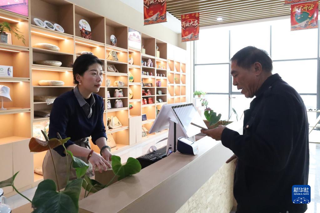 4月19日,游客在甘肅省白銀市會(huì )寧紅色驛站購買(mǎi)文創(chuàng )產(chǎn)品。