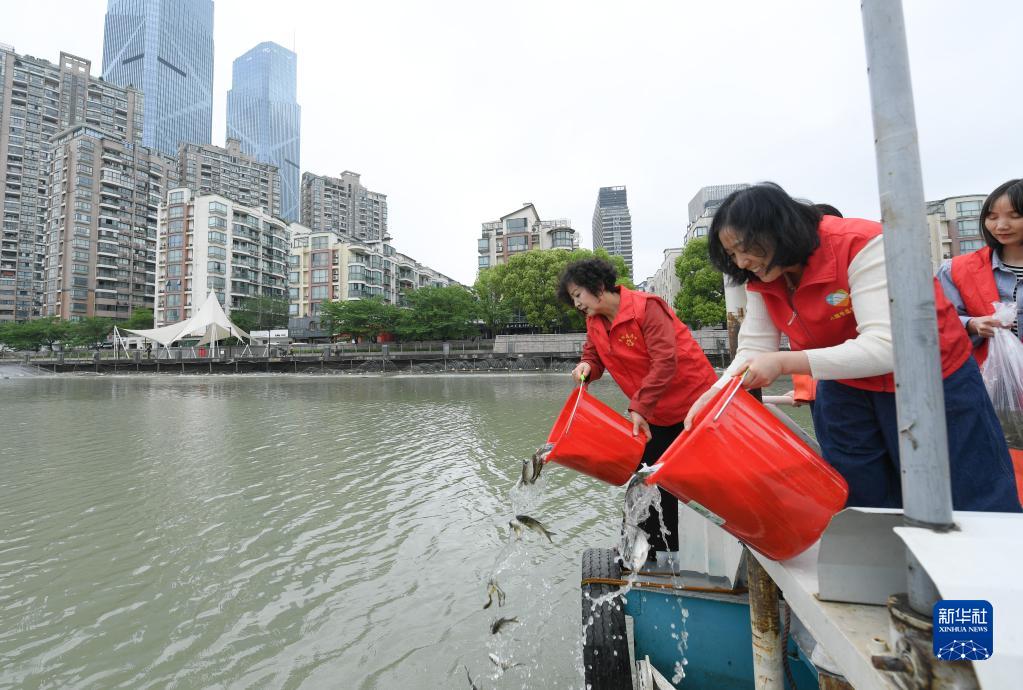 4月20日,湖州市愛(ài)山街道的志愿者在河道投放魚(yú)苗。