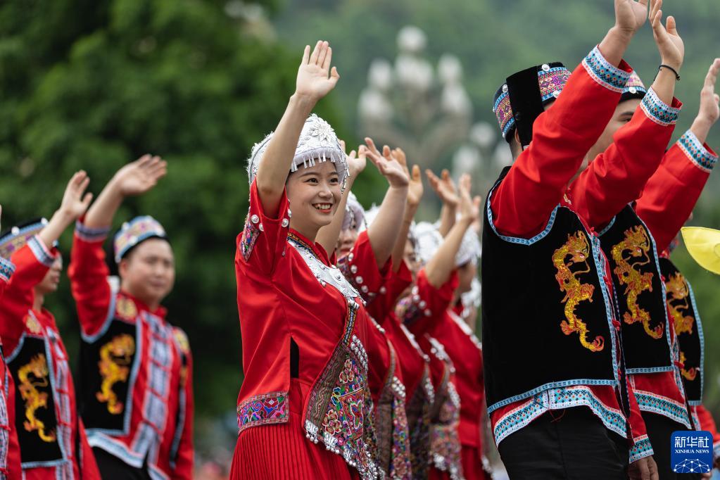 當日,四川省級非遺“興文苗族花山節”展示傳承活動(dòng)在四川省興文縣市民廣場(chǎng)舉行?;顒?dòng)上融入傳統祭祀、農耕文化、民族團結等內容的展演和苗家長(cháng)桌美食宴,讓賓客感受到熱烈的節日氛圍。