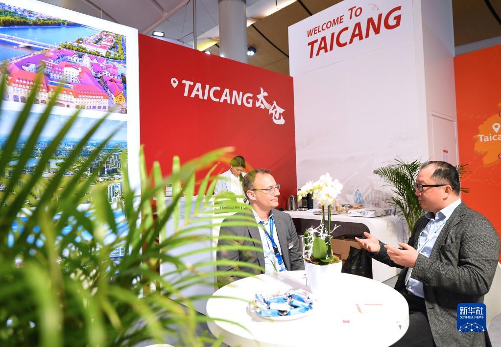 4月19日,在德國漢諾威工博會(huì )江蘇省太倉市展區,工作人員(右)與參觀(guān)者交談。