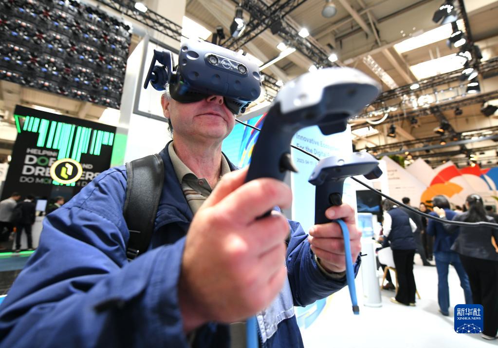 4月19日,在德國漢諾威工博會(huì )上,一名男子通過(guò)VR設備了解海爾卡奧斯工業(yè)互聯(lián)網(wǎng)平臺。