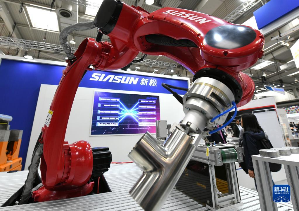 這是4月18日在漢諾威工博會(huì )上拍攝的新松工業(yè)機器人。