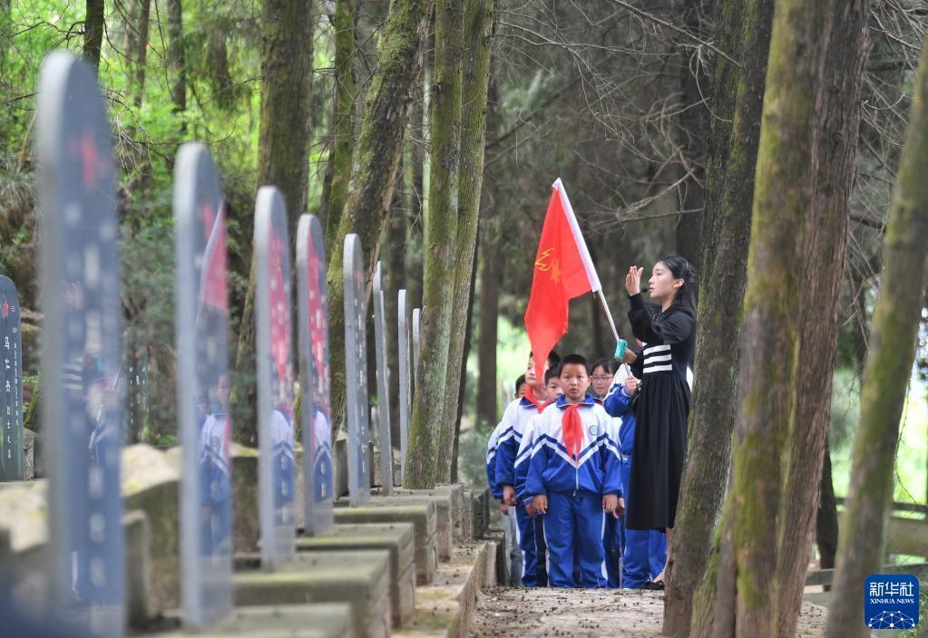 4月18日,馮煉組織學(xué)生來(lái)到長(cháng)坪山烈士陵園,向學(xué)生講述紅軍故事。