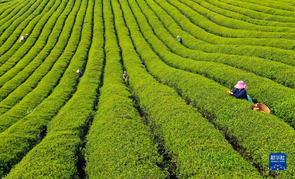 4月20日,茶農在貴州省銅仁市松桃苗族自治縣正大鎮茶園采茶(無(wú)人機照片)。