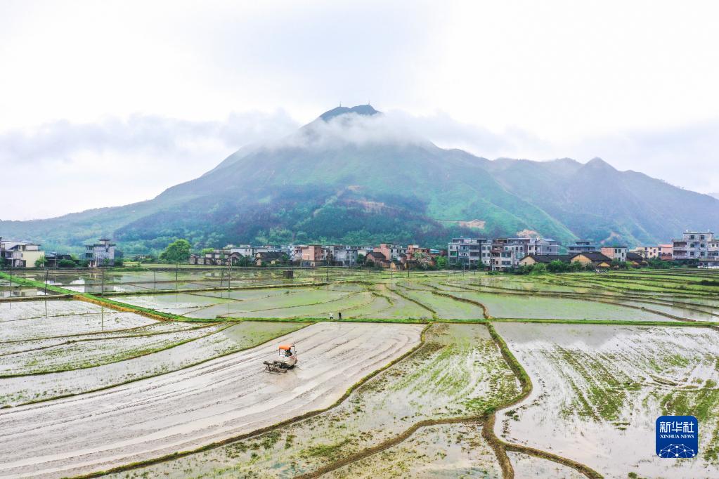 4月20日,在湖南省常寧市廟前鎮雙鳳村,農民駕駛農機在整理田地(無(wú)人機照片)。