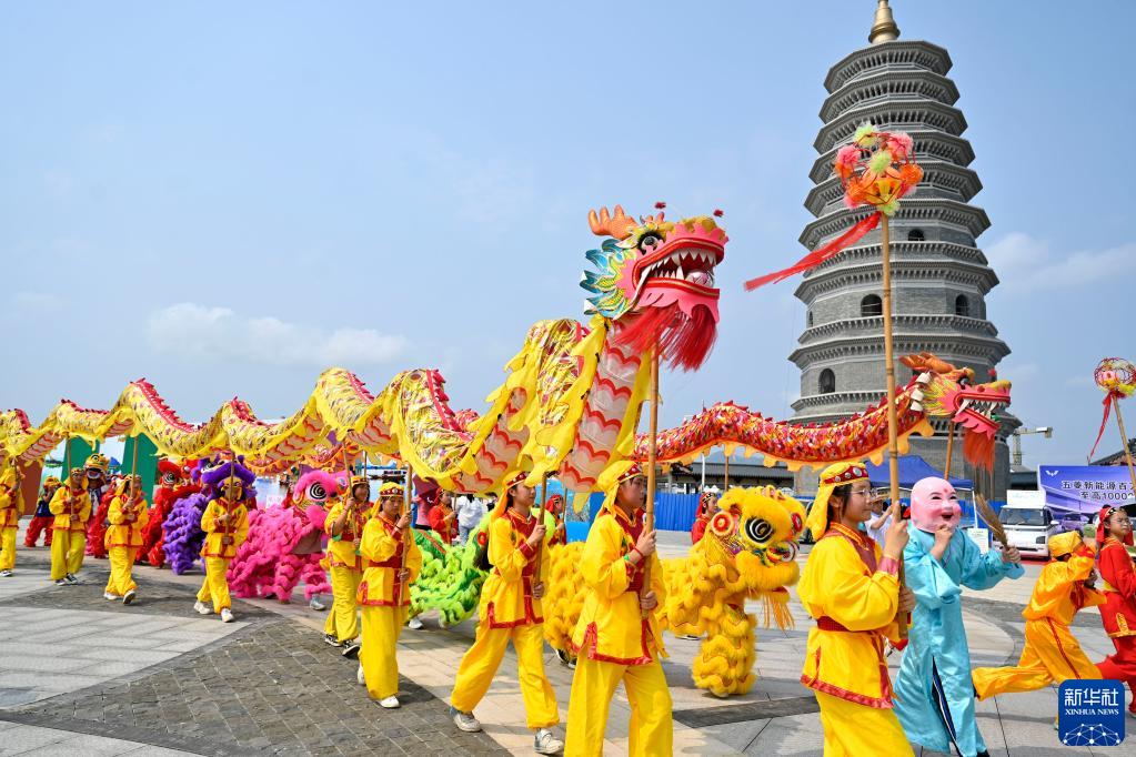 4月20日,在柳城縣鳳山鎮鳳鳴廣場(chǎng),孩子們參加舞龍展演活動(dòng)。