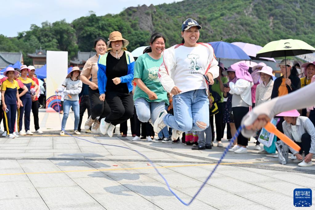 4月20日,在柳城縣鳳山鎮鳳鳴廣場(chǎng),村民在跳繩。