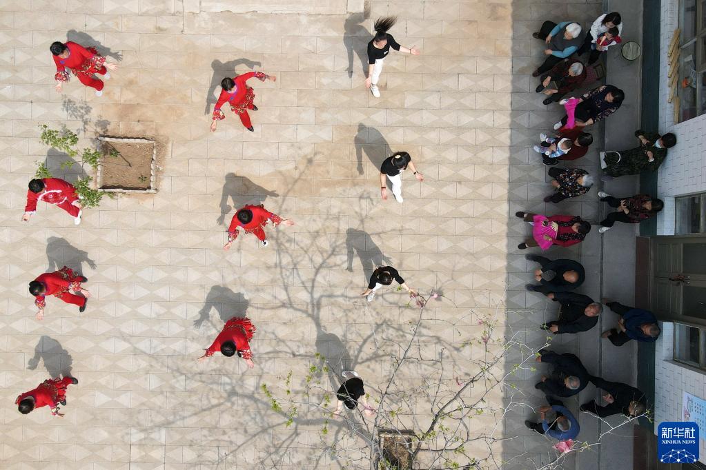 4月20日,志愿者在河北省平鄉縣后馬康村“幸福小院”內為老人們表演節目(無(wú)人機照片)。