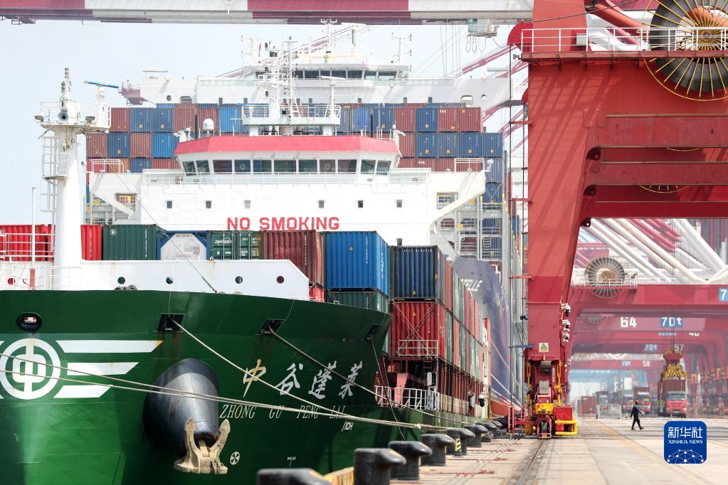 4月20日,在山東港口青島港前灣聯(lián)合集裝箱碼頭,一艘貨輪在裝載貨物。