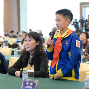 4月20日,參加活動(dòng)的一名小男孩在位于北京的主會(huì )場(chǎng)內向航天員提問(wèn)。