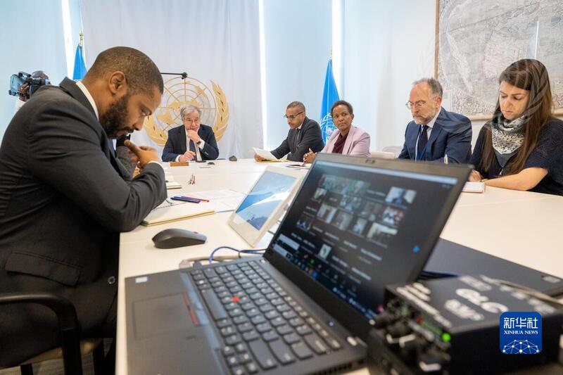 4月20日,聯(lián)合國秘書(shū)長(cháng)古特雷斯在位于紐約的聯(lián)合國總部參加非洲聯(lián)盟召集的蘇丹局勢視頻會(huì )議。