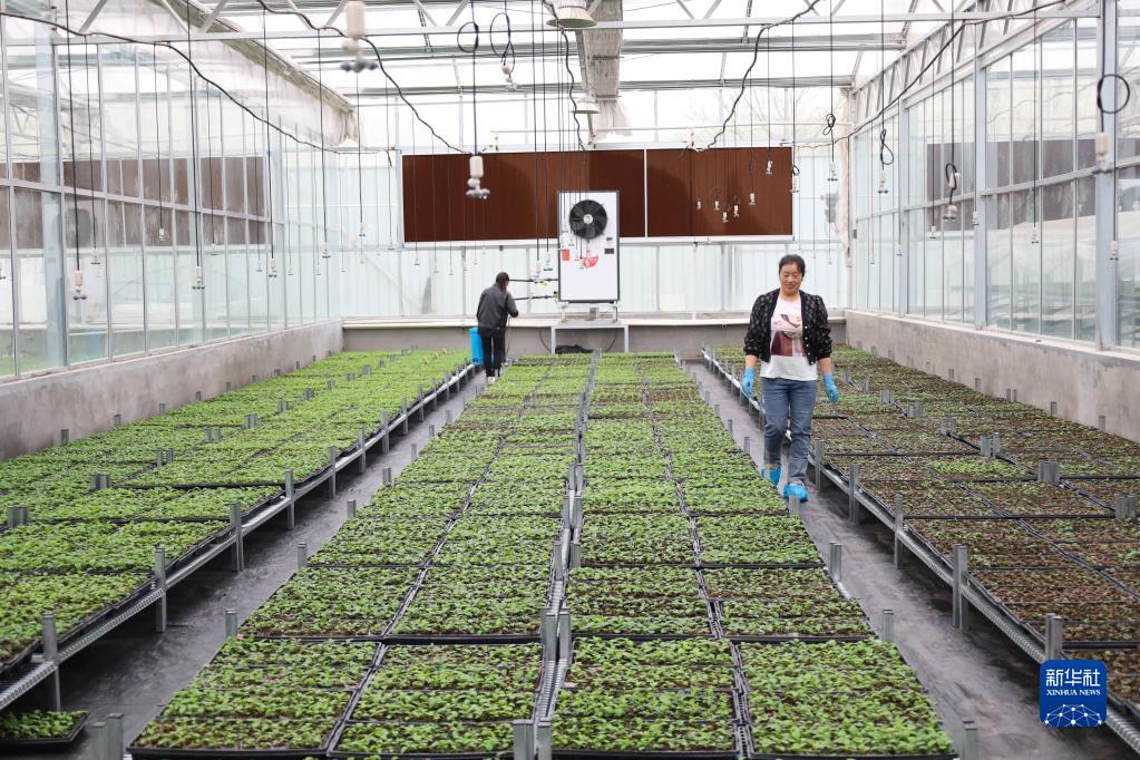 4月20日,在靜寧縣城川鎮靜寧蘋(píng)果良種苗木組培繁育中心,工作人員管護蘋(píng)果組培苗木。