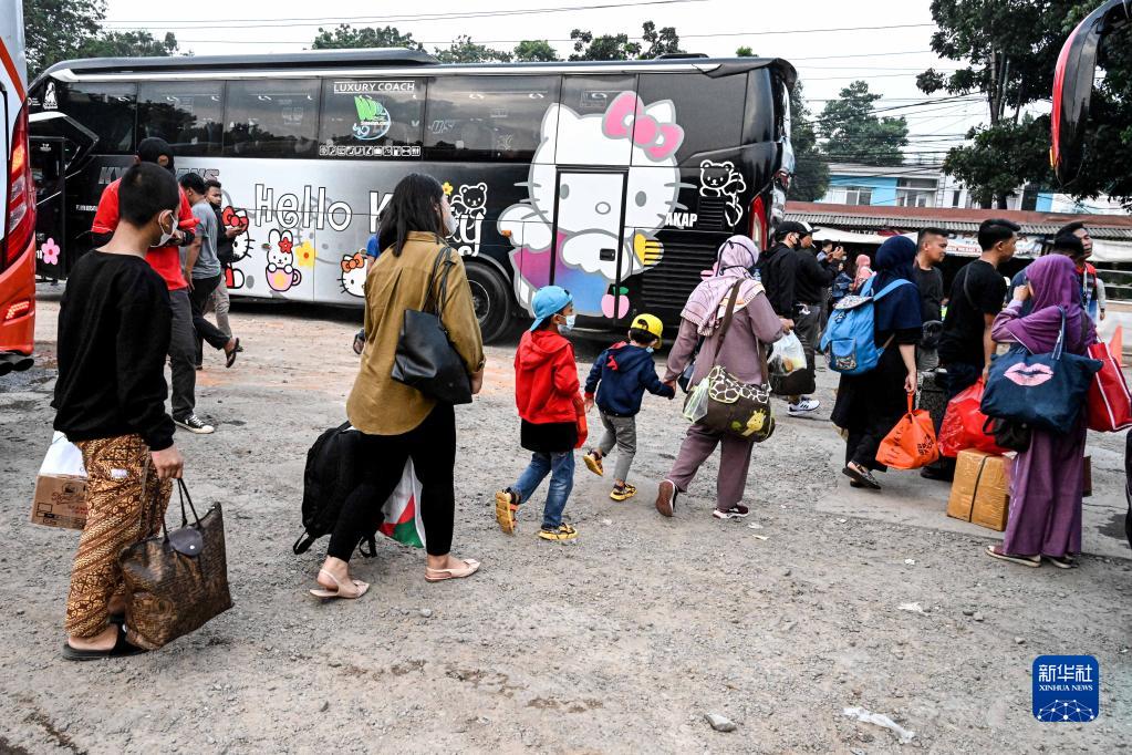 4月18日,人們在印度尼西亞雅加達登上返鄉的大巴車(chē)。