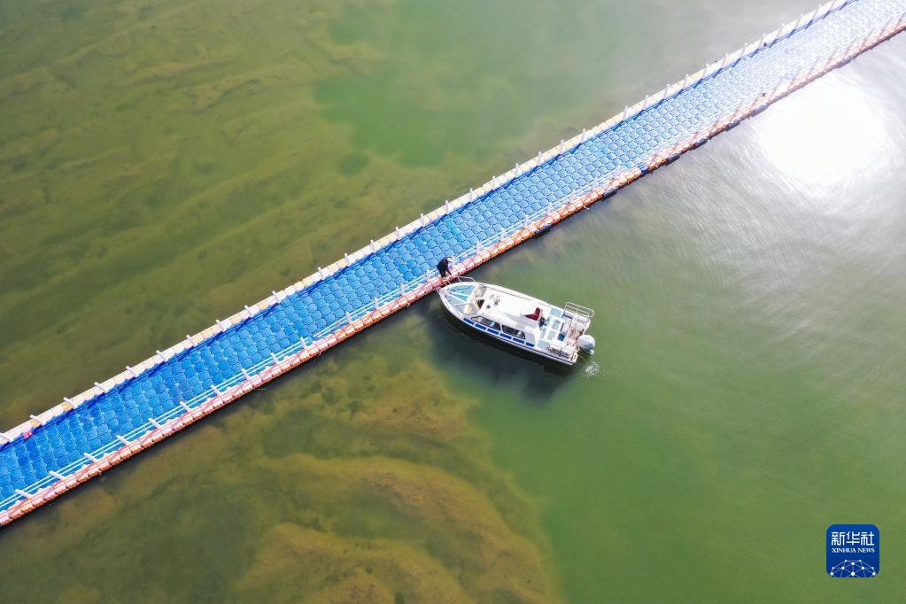 4月19日,胡登雨在岱海一處碼頭停船(無(wú)人機照片)。