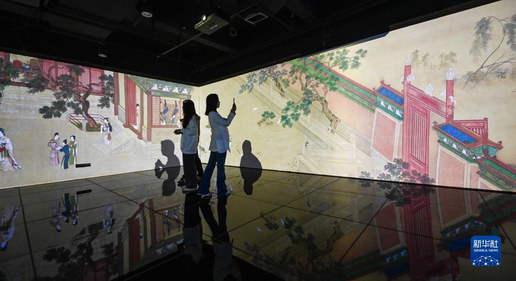 4月21日,讀者在嘉興市圖書(shū)館元宇宙閱讀體驗館的藝術(shù)課堂通過(guò)環(huán)幕體感投影學(xué)習古代書(shū)畫(huà)知識。