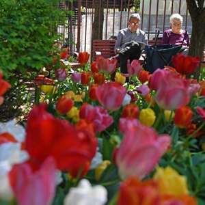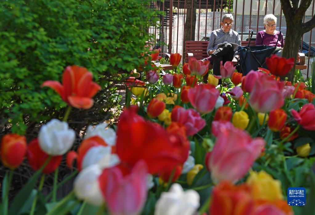4月20日,在美國紐約的一處花園,人們在盛開(kāi)的郁金香附近休憩。