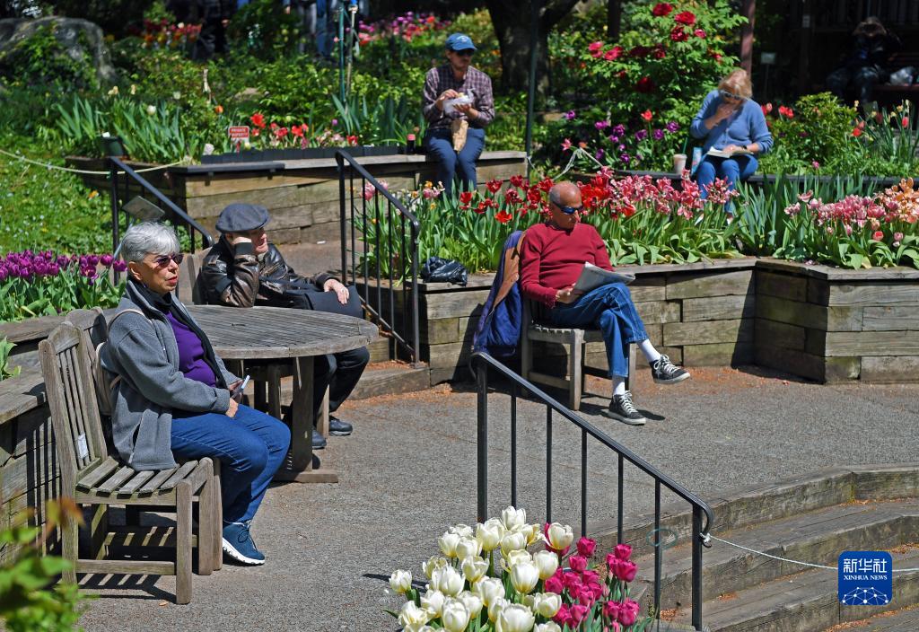 4月20日,在美國紐約的一處花園,人們在盛開(kāi)的郁金香附近休憩。