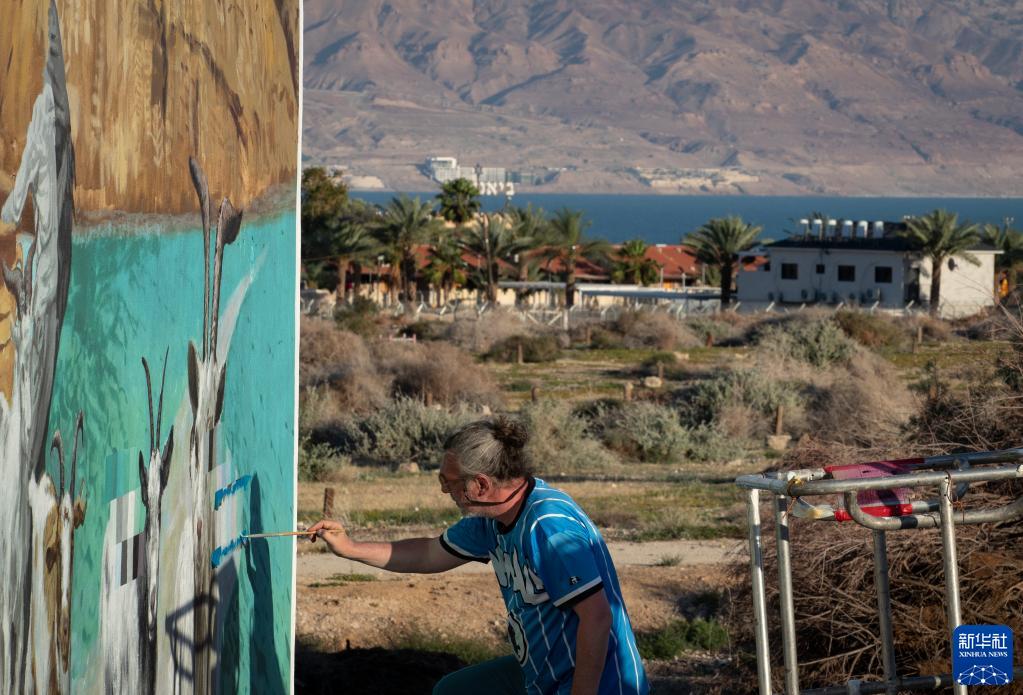 4月20日,藝術(shù)家在死海西岸的廢棄房屋外墻上創(chuàng )作“關(guān)注死?!敝黝}畫(huà)作。
