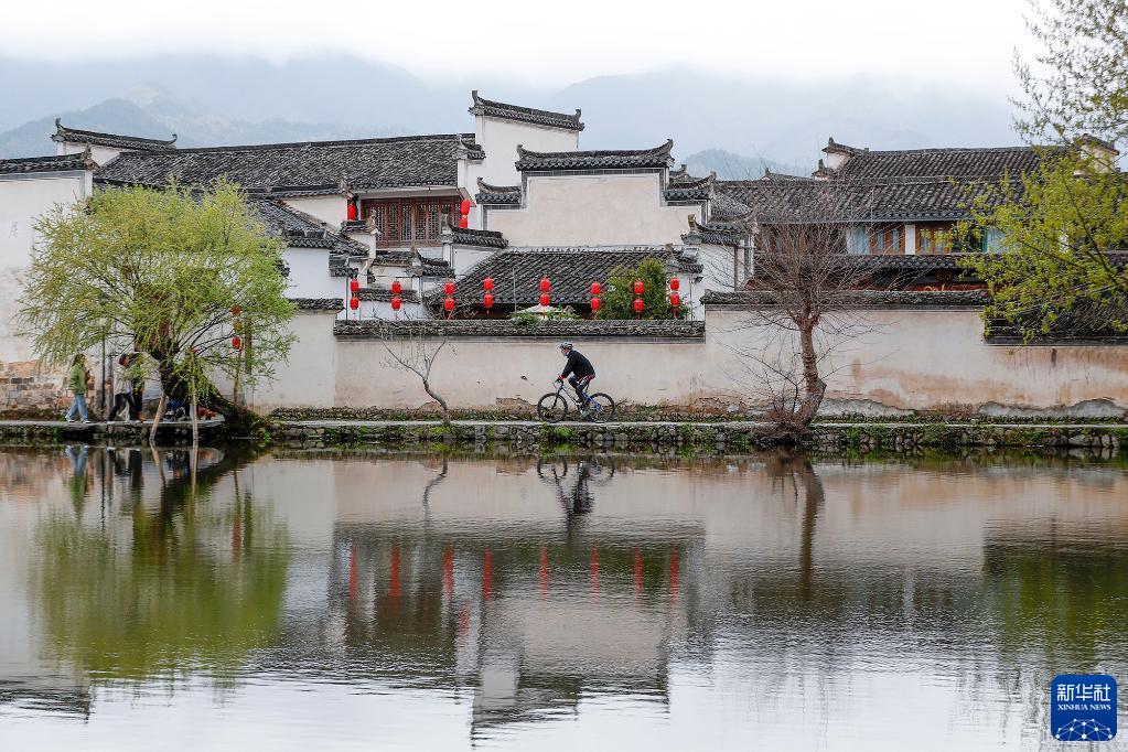 阿明在黟縣宏村南湖畔小道騎行(3月23日攝)。
