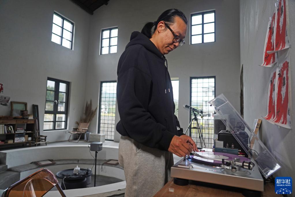 劉龍在民宿里用唱片機播放音樂(lè )(3月29日攝)。