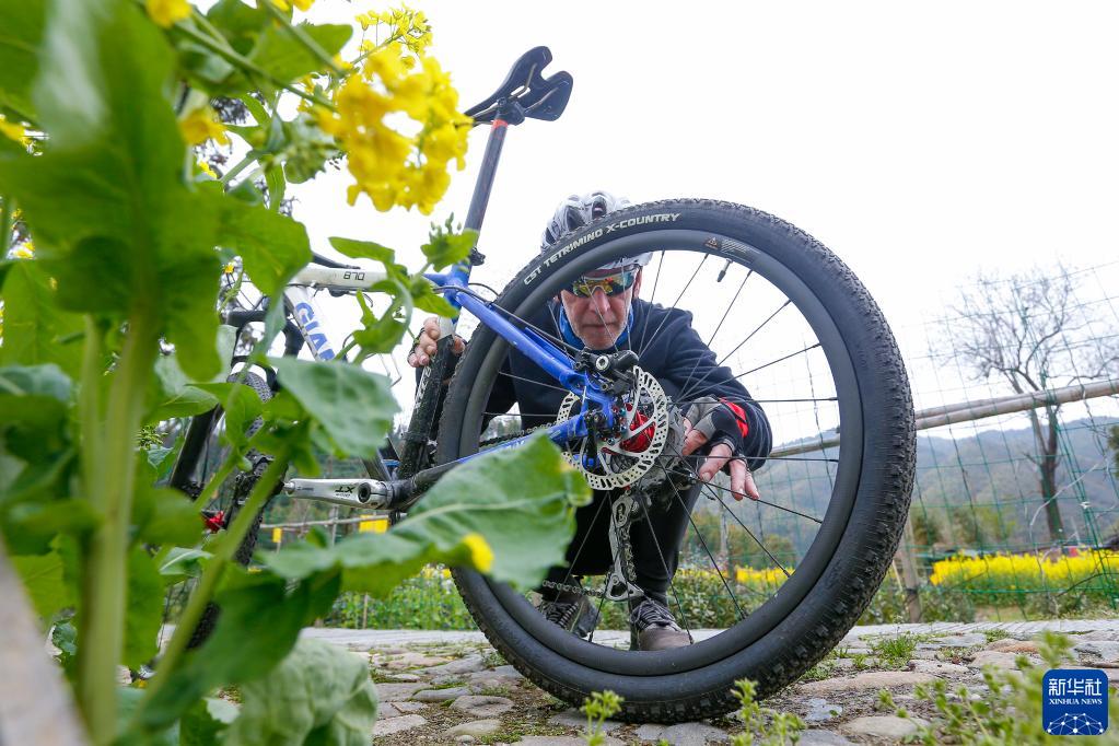 阿明在鄉間道路上騎行時(shí)查看自行車(chē)狀況(3月23日攝)。