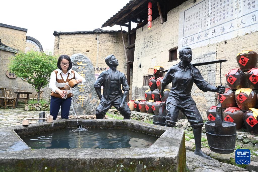 4月20日,游客在屏南縣代溪鎮北墘村一處可用于釀酒的古井前取水飲用。