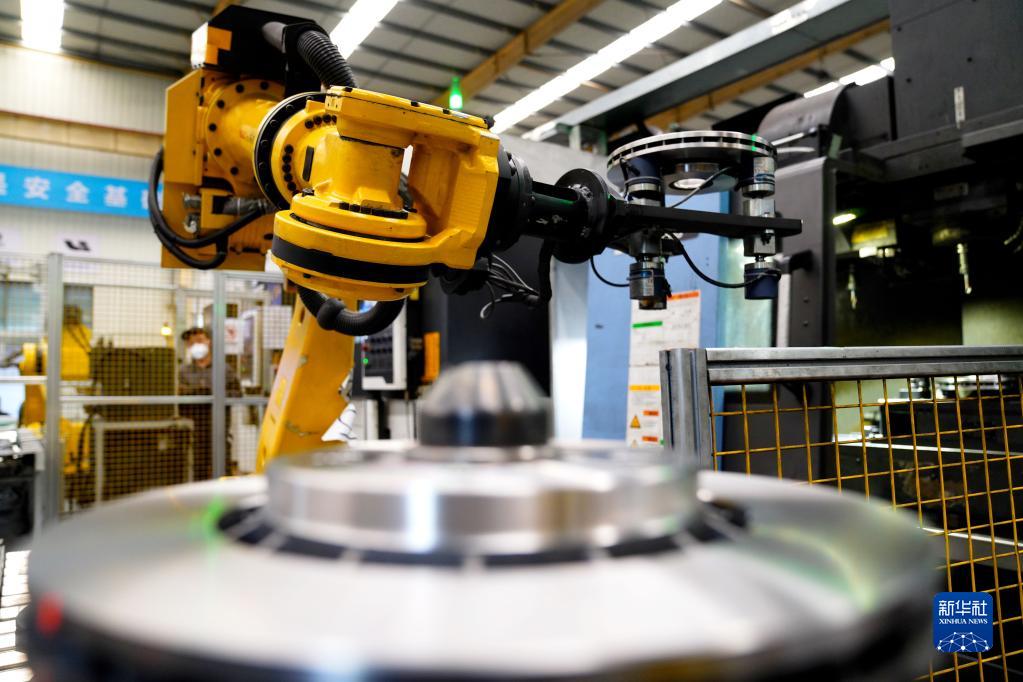 4月20日,在山東惠宇汽車(chē)零部件有限公司,工業(yè)機器人在加工制動(dòng)盤(pán)。