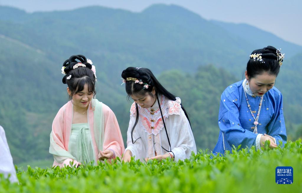 4月21日,身著(zhù)傳統服裝的游客在宣恩縣伍家臺村茶園體驗采茶。