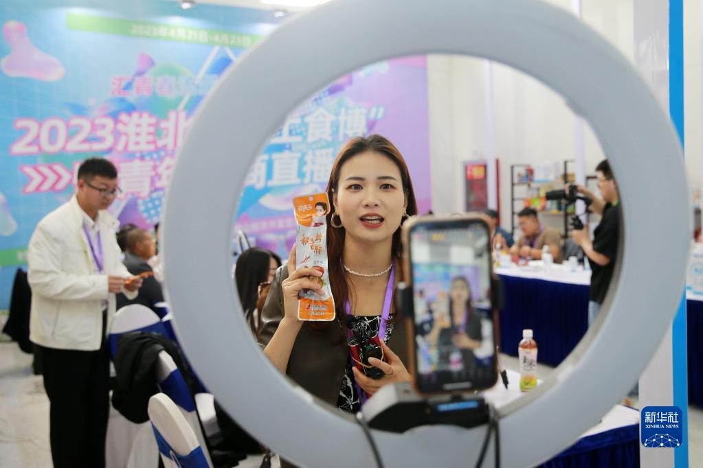 4月21日,在淮北市相山經(jīng)濟開(kāi)發(fā)區食品博覽園會(huì )展中心,參展商工作人員通過(guò)直播推銷(xiāo)食品。
