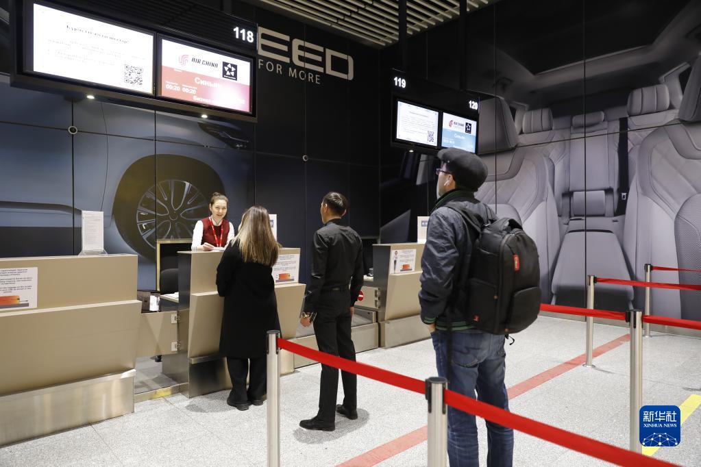 4月21日,在哈薩克斯坦首都阿斯塔納的納扎爾巴耶夫國際機場(chǎng),旅客排隊辦理值機手續,準備搭乘國航北京-西安-阿斯塔納航線(xiàn)返程航班。