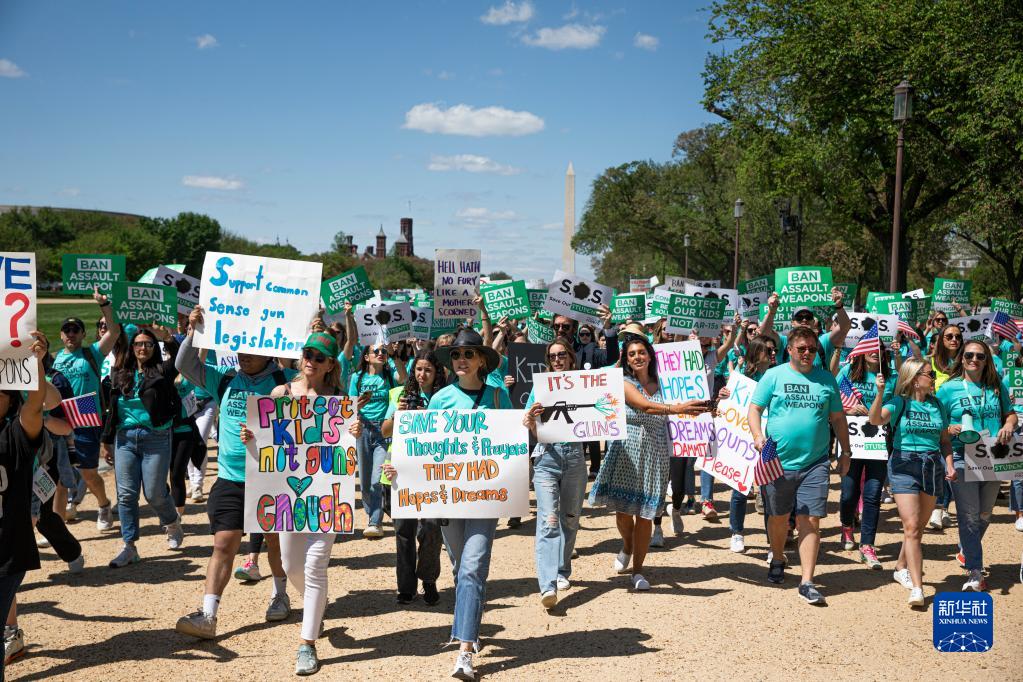 4月17日,人們在美國首都華盛頓參加控槍游行,呼吁禁止銷(xiāo)售攻擊性武器,應對美國槍支暴力問(wèn)題。