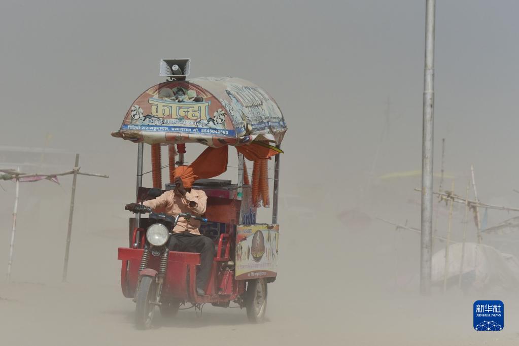4月18日,在印度北方邦普拉亞格拉杰,一名男子冒著(zhù)風(fēng)沙出行。