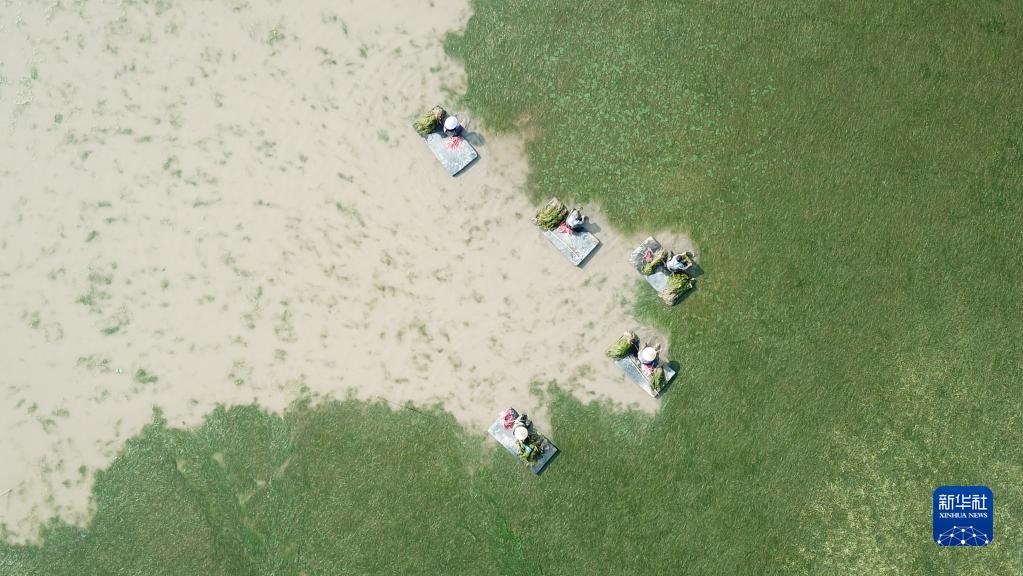 4月20日,工人在大通湖水生植物產(chǎn)業(yè)示范園內采收水草(無(wú)人機照片)。