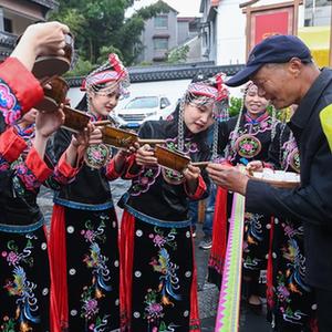 4月22日,畬族姑娘身著(zhù)傳統服飾在團結村的“三月三”旅游文化周上給游客敬上迎賓酒。