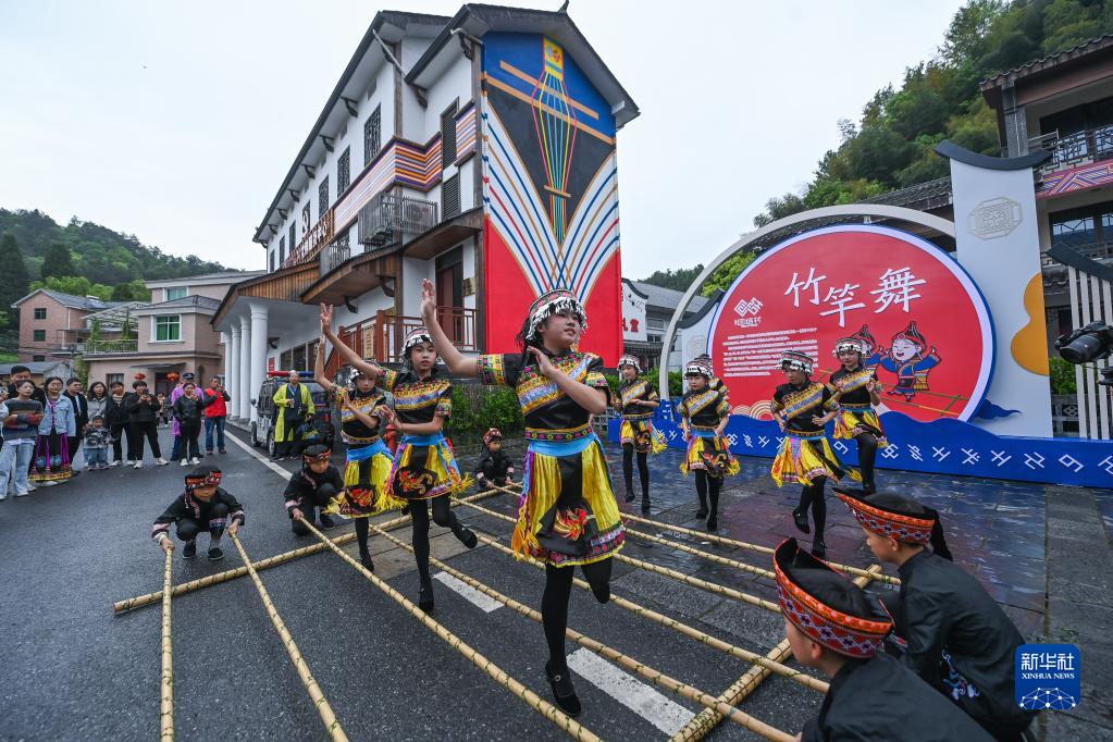 4月22日,孩子們身著(zhù)畬族傳統服飾在團結村的“三月三”旅游文化周上表演竹竿舞。
