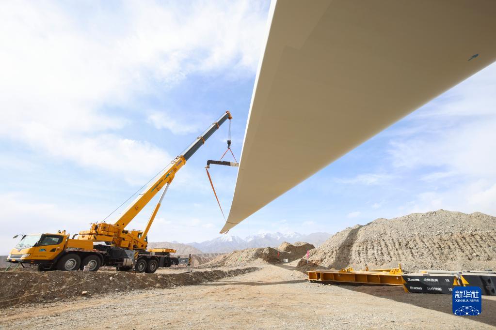 4月21日在新疆克孜勒蘇柯?tīng)柨俗巫灾沃轂跚】h拍攝的等待吊裝的風(fēng)機葉片。