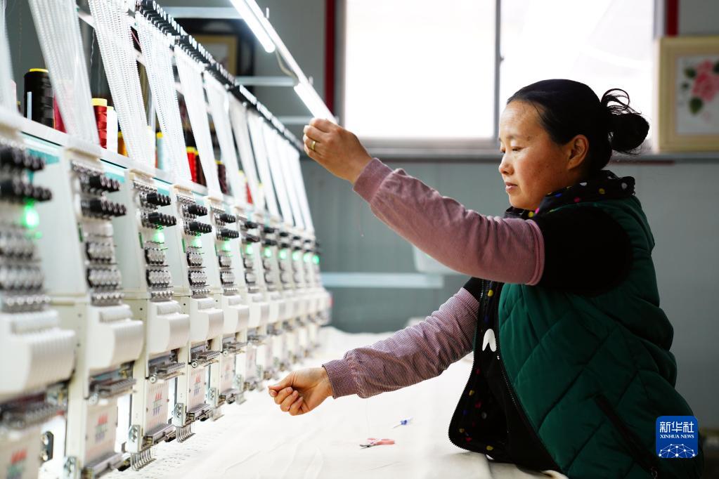 4月22日,在惠民縣桑落墅鎮“惠民工坊”,工作人員在針織機前整理線(xiàn)軸。
