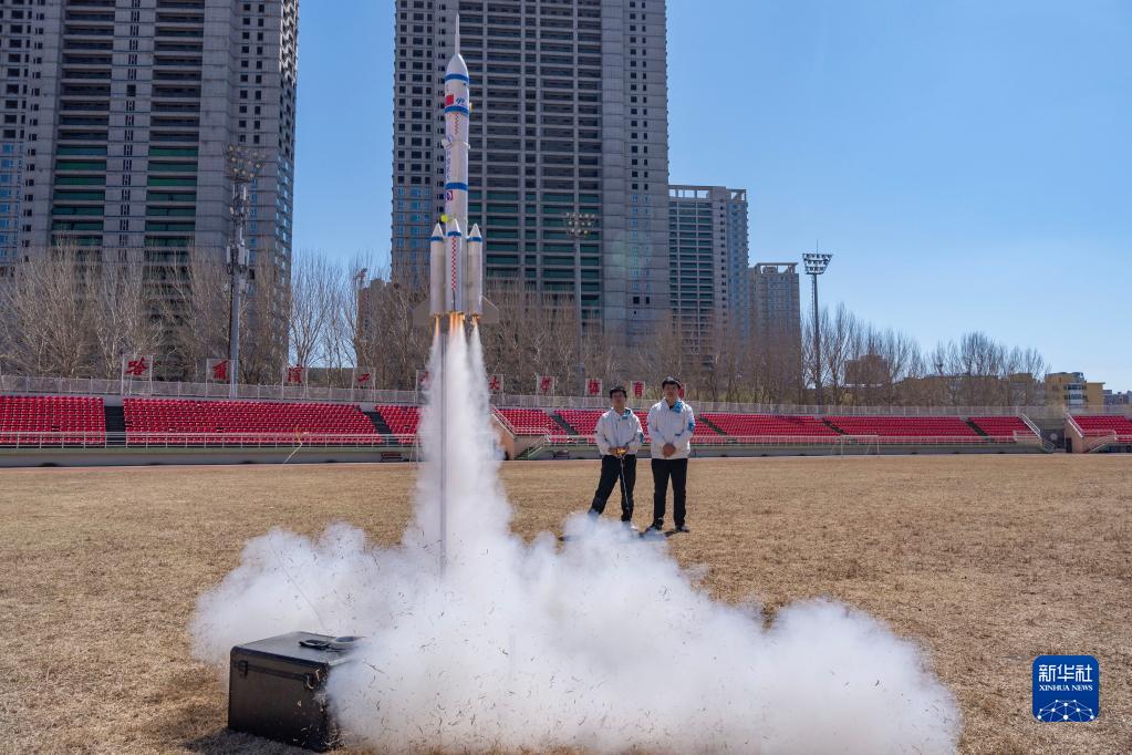 4月22日,在哈爾濱工業(yè)大學(xué)體育場(chǎng),航模協(xié)會(huì )的學(xué)生操控航模點(diǎn)火發(fā)射。
