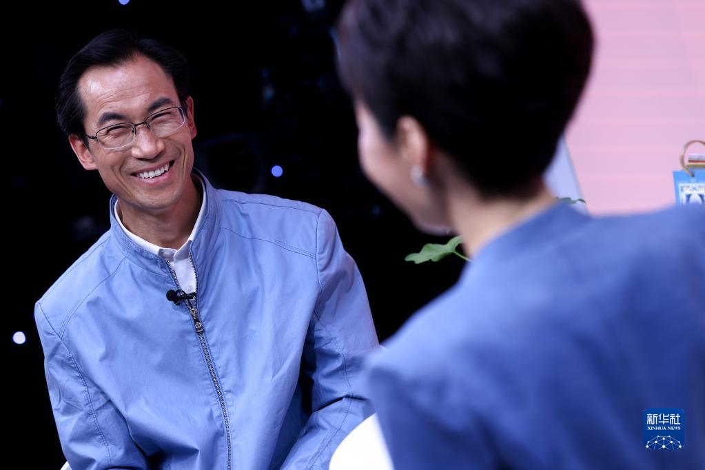 4月12日,在中國教育電視臺一處演播室,朱彥軍(左)受邀參加《育見(jiàn)》欄目關(guān)于“世界讀書(shū)日”系列訪(fǎng)談的錄制。新華社記者 劉金海 攝