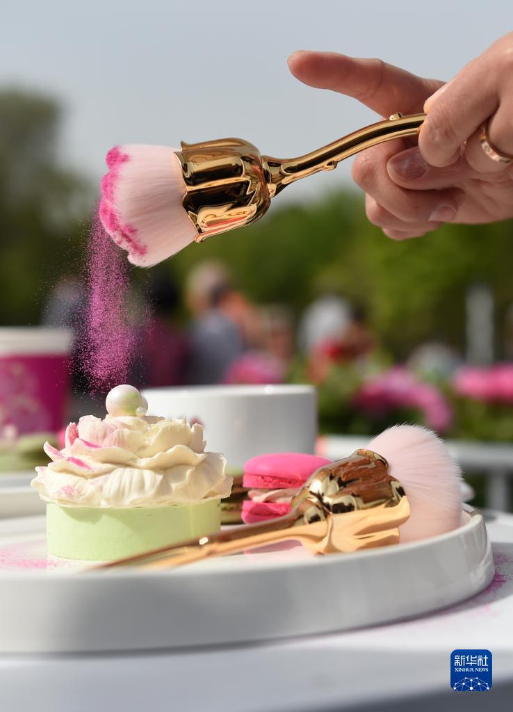 4月19日,工作人員展示圓明園推出的以牡丹花為主題的甜品,游客可以自己動(dòng)手,將粉紅色的果粉撒在牡丹花造型的甜品上。