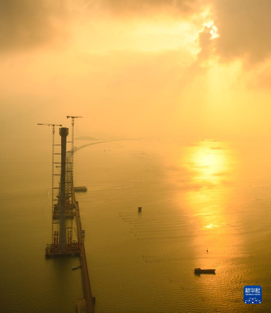 這是4月17日拍攝的夕陽(yáng)下的黃茅??绾Mǖ傈S茅海大橋西塔。