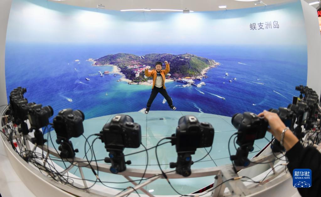 4月22日,一名小朋友在海南館體驗環(huán)繞拍攝。