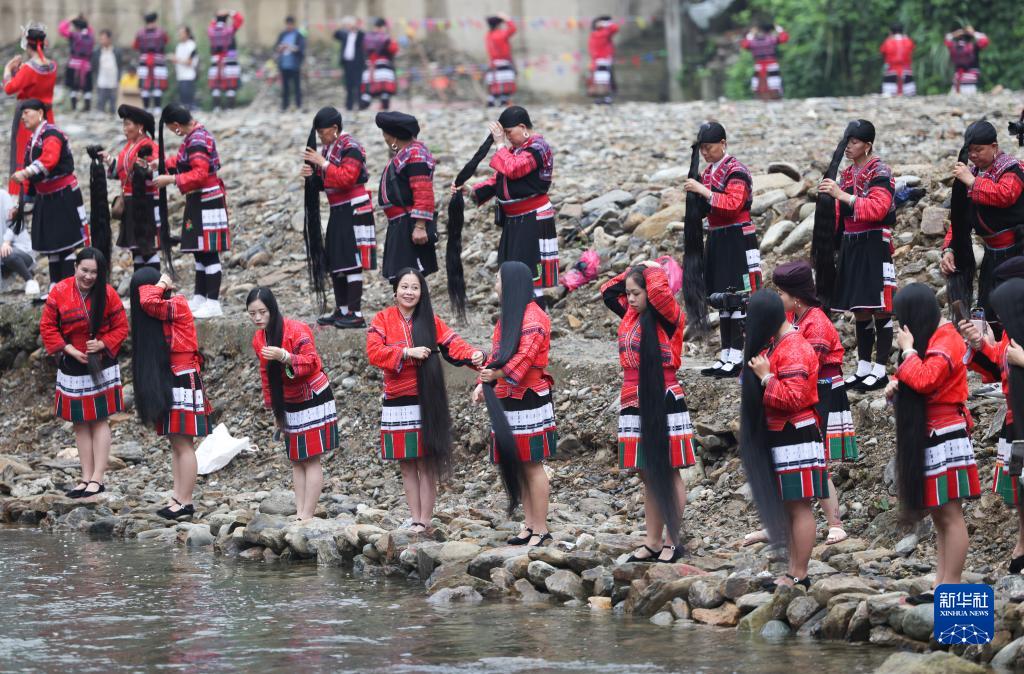 當日是農歷三月初三,廣西桂林市龍勝各族自治縣黃洛瑤寨舉行“三月三龍脊長(cháng)發(fā)節”活動(dòng),吸引游客前來(lái)參觀(guān)游覽。黃洛瑤寨的紅瑤族婦女有世代相傳的蓄發(fā)習俗,平均頭發(fā)長(cháng)度達1.7米,最長(cháng)的有2.72米。