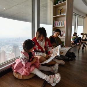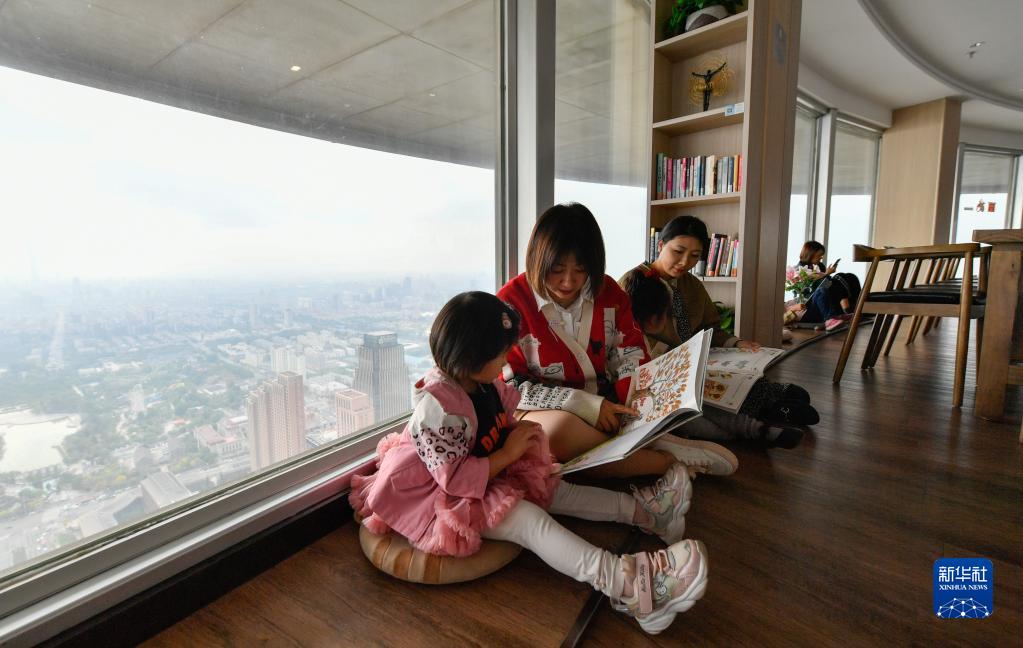 4月22日,在天津市河西區天塔西岸書(shū)齋,讀者在“高空書(shū)吧”里閱讀書(shū)籍。