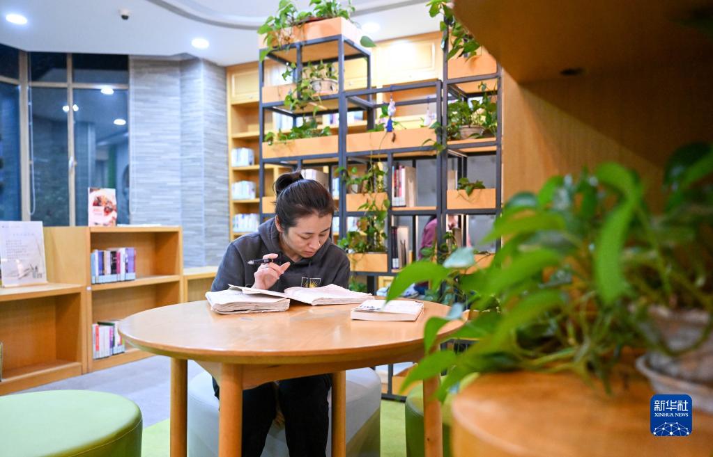 在天津市河西區新梅江文體中心西岸書(shū)齋,讀者在閱覽室內進(jìn)行夜間延時(shí)閱讀(4月19日攝)。