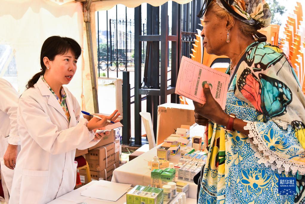 4月20日,醫療隊成員在喀麥隆首都雅溫得的義診活動(dòng)現場(chǎng)為病患發(fā)放免費藥物。
