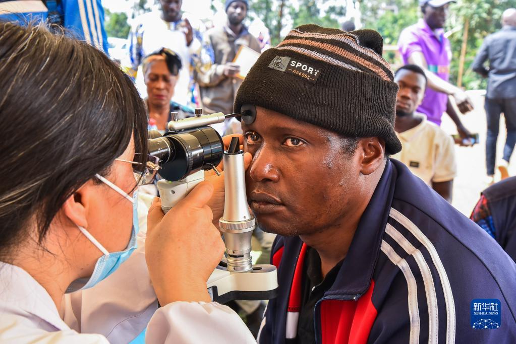 4月20日,醫療隊成員在喀麥隆首都雅溫得的義診活動(dòng)現場(chǎng)為病患檢查眼睛。