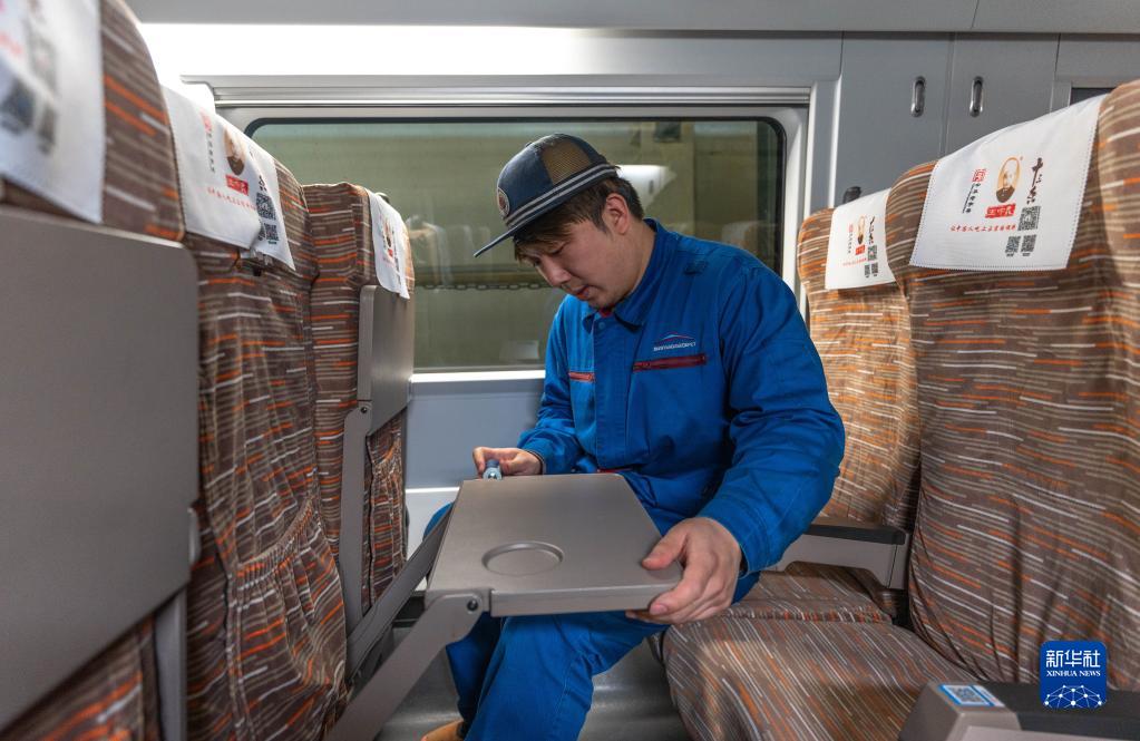 4月22日,在沈陽(yáng)動(dòng)車(chē)段沈陽(yáng)北動(dòng)車(chē)運用所,技術(shù)人員在列車(chē)內維修座椅桌板。