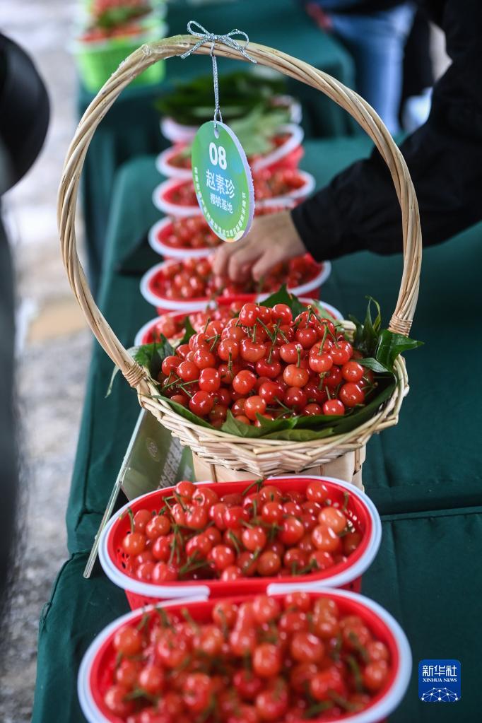 4月23日在櫻桃采摘節活動(dòng)現場(chǎng)拍攝的展銷(xiāo)的櫻桃。